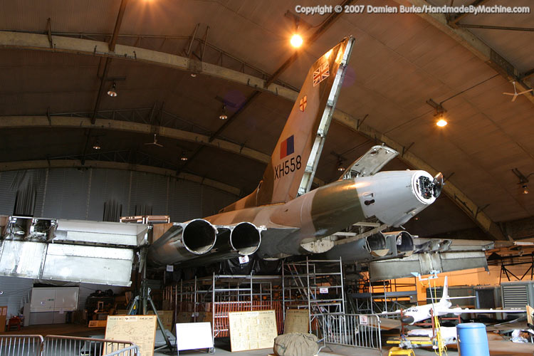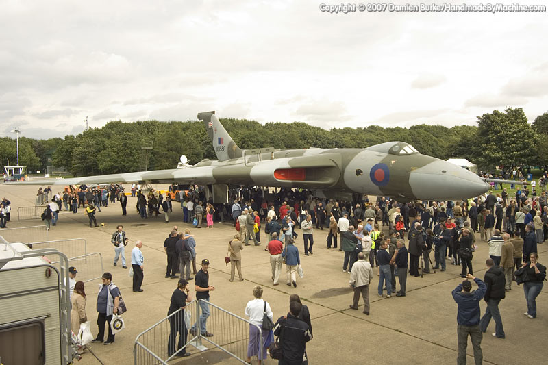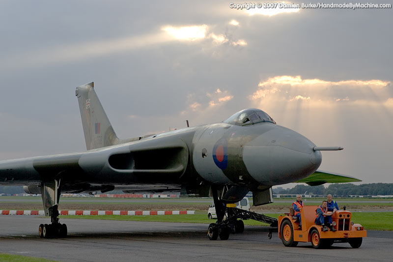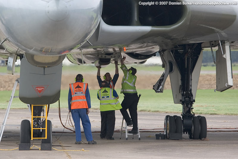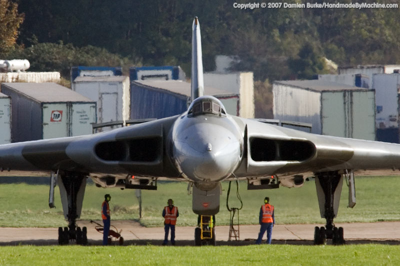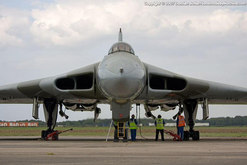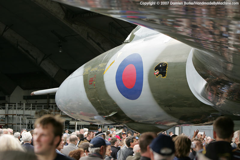 In 2005 the Waltons sold the aircraft to the Vulcan to the Sky Trust, and restoration work commenced. Over the last two years the aircraft has practically been rebuilt from the ground up, with over 5 miles of wiring replaced, every component inspected and repaired or replaced as necessary, any corrosion rectified, new engines installed, redundant systems removed to save weight (and therefore stress on the airframe), new and far more advanced avionics including GPS navigation kit installed... it has been a mammoth task, undertaken by a mix of personnel from Marshalls of Cambridge, the RAF, and TVOC staff.