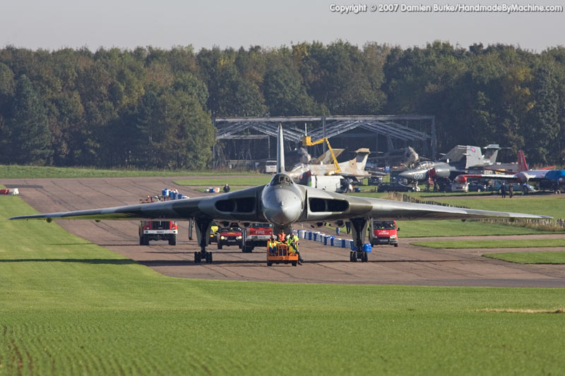 Built in 1941/1942, Bruntingthorpe was originally in use by the Wellingtons of Bomber Command, though as an Operational Training Unit rather than a frontline unit. After the war it became a USAF station and the main runway was extended for jet types such as the B-47 and RB-66. Closed in 1962, the site was bought by the Waltons in 1972 and turned into a high-performance test track and storage facility for motor vehicles. Many of the dispersals and much of the perimeter track survive, along with the entire length of the runway, mostly used these days as a track for testing and racing. Sadly for the Vulcan fans gathered outside, the airfield has been surrounded by dense trees and earth banking to protect the local villages from the worst of the track noise, and this made viewing the take-off from outside impossible, and even the engine start and taxiing were inaudible from many spots outside the airfield. Regular SMS text message updates were sent by those on the airfield to those outside, while anticipation mounted.